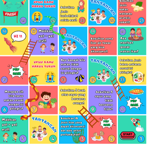 Permainan ular tangga edukasi bisa dilakukan sebagai pilihan dalam intervensi edukasi gizi pada anak sekolah. Metode ini merupakan salah satu cara efektif karena terbukti dapat meningkatkan kemampuan untuk berinterkasi dengan kehidupan social serta dapat digunakan sebagai alat untuk bermain sambil belajar, menjadikan anak lebih aktif dan meningkatkan kualitas perkembangan fisik-motorik, Bahasa dan emosional (4). Suatu penelitian menunjukkan bahwa pemberian edukasi gizi seimbang pada anak sekolah dasar dengan metode permainan ular tanga dapat meningkatkan pengetahuan dan sikap gizi seimbang (5).