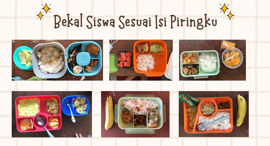 Selain meningkatkan pengetahuan anak sekolah mengenai Pendidikan gizi dan pentingnya gizi bagi tumbuh kembang serta kecerdasan otak, perlu suatu tindakan atau aksi agar anak-anak dapat menerapkan di kehidupan sehari-hari yaitu memberikan contoh hidangan yang seimbang dengan “Gerakan Membawa Bekal ke Sekolah”. Gerakan ini merupakan suatu Gerakan untuk menggalakkan kegiatan membawa bekal makanan dan minuman ke sekolah menggunakan tempat makan dan botol yang dapat digunakan secara berulang supaya meminimalisir sampah plastik (6). Gerakan ini tentunya melibatkan peran dan dukungan orang tua maupun guru. Intervensi yang telah dilakukan oleh mahasiswa Jurusan Gizi Poltekkes Kemenkes Semarang menunjukkan bahwa pada minggu ke-2 sebanyak 96% siswa sudah membawa bekal menu lengkap sesuai Isi Piringku.