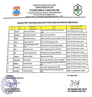 Pembuatan Jadwal PMT Posyandu yang disepakati setiap awal tahun dengan kader posyandu telah disetujui oleh Kepala Puskesmas dan dijadikan pedoman dalam pembuatan PMT di semua Posyandu di Puskesmas Cibeureum. Resep PMT Posyandu tahun 2024 sudah mengalami pembaharuan yaitu dari bulan Januari-Desember : Putu Ayu daun Kelor, Puding Lumut Daun Kelor, Bolu Kukus Daun Kelor, Nugget Tong Dolor, Roti Rougout Goreng isi sayur kelor. Agar-agar Padalor, Pukis Budalor, Schootel Kendalor, Cookies daun kelor. Ragam resep yang dibuat berdasarkan kreasi dari Ahli Gizi dan masukan dari kader, masyarakat, serta petugas lainnya. Pembuatan jadwal PMT ini dilakukan disemua Posyandu yang ada di kota Cimahi namun setiap wilayah memiliki kreasi inovasi sesuai kondisi wilayah masing-masing.