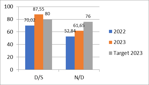 Selain itu cakupan N/D bulan Januari – Desember 2023 di Puskesmas Cibeureum rata rata di bawah target (76%) dan rata-rata cakupan N/D (Naik/Ditimbang) tiap bulannya adalah 61.65%, tahun 2022 adalah 52.84% ada peningkatan sebesar 8.81%. Cakupan N/D masih di bawah target namun sudah meningkat dari tahun sebelumnya, hal ini sudah menunjukan hasil evaluasi positif dari suatu inovasi. Penurunan berat badan balita dipengaruhi oleh asupan makanan, daya terima makan anak, pola asuh dan anak tidak sedang sakit.