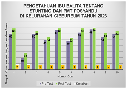 Hasil pre-test dan post-test menunjukan dari 72 responden ibu balita dengan 10 pertanyaan menunjukkan ada peningkatan pengetahuan ibu balita. Hasil pemberian PMT penyuluhan posyandu dengan inovasi Makalor (makanan olahan daun kelor) ternyata dapat meningkatkan pengetahuan ibu tentang stunting dan PMT dibantu media leafleat, booklet kumpulan menu olahan daun kelor yang sudah dibuat oleh tenaga gizi. PMT posyandu ini menjadi salah satu upaya pengembangan daun kelor, baik pada ibu hamil atau ibu balita sebagai alternatif upaya pencegahan stunting.